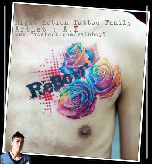 前胸时尚精美的一款七彩玫瑰纹身图案