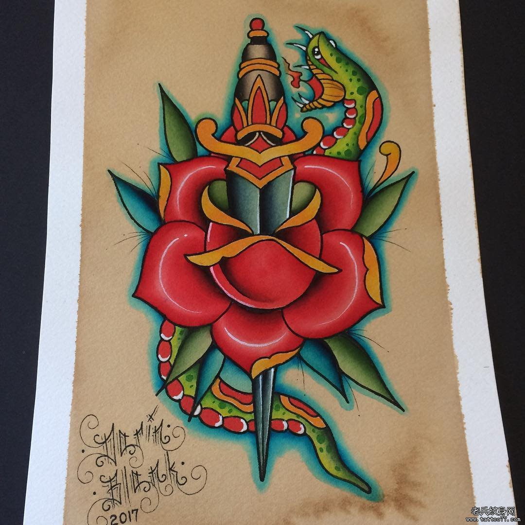 黑灰蛇玫瑰花纹身图案