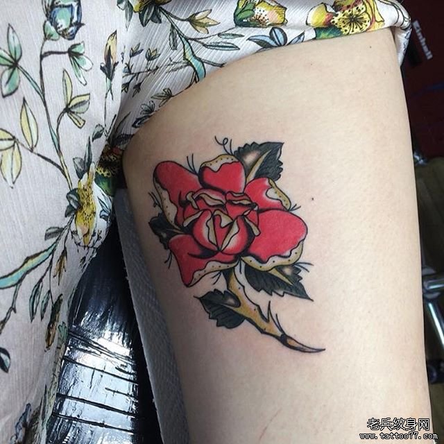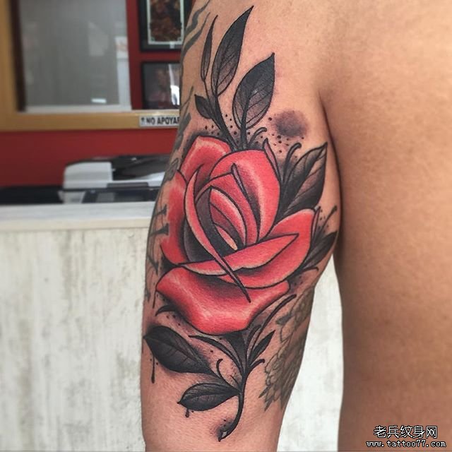 手臂彩色写实玫瑰花纹身图案
