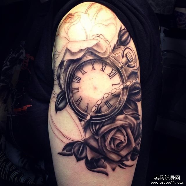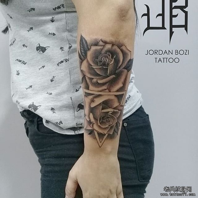 手臂黑灰骷髅玫瑰花纹身图案