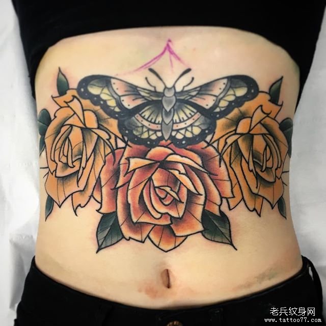 彩色玫瑰花蝴蝶纹身图案