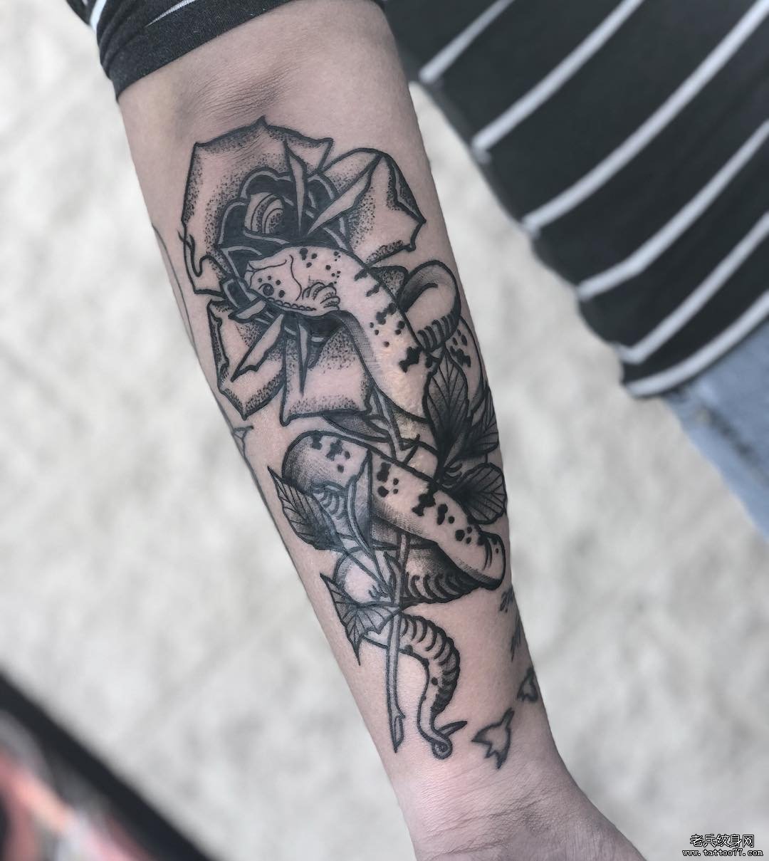 手臂黑灰蛇玫瑰花纹身图案