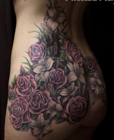 臀部彩色玫瑰花卉纹身图案纹身图片
