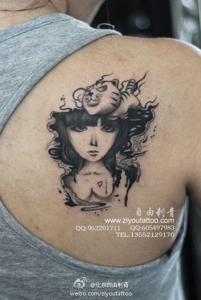 背部漂亮的插画美女纹身图案