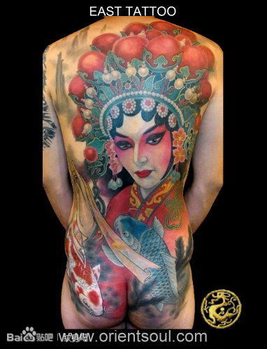 男人背部经典的满背花旦纹身图案
