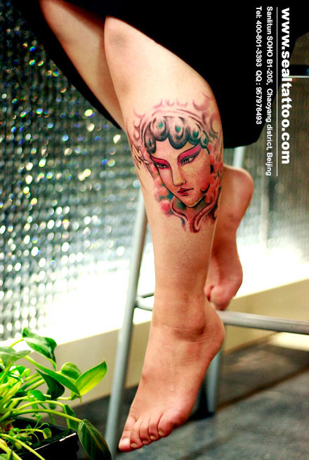 腿部唯美漂亮的花旦纹身图案