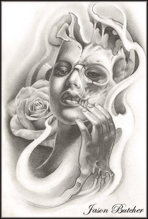 一款另类欧美美女骷髅玫瑰纹身图案纹身图片