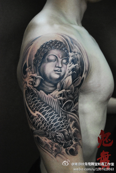 男人手臂经典的黑白鲤鱼与佛头纹身图案