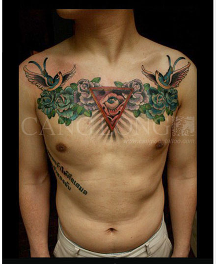男人前胸超帅经典的上帝之眼玫瑰花纹身图案