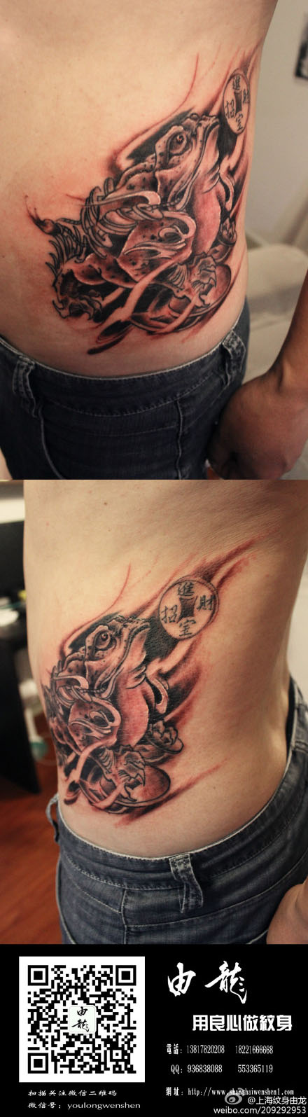 男生侧腰经典的招财金蝉纹身图案