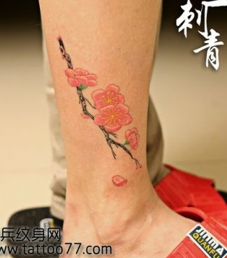 美女腿部彩色桃花纹身图案