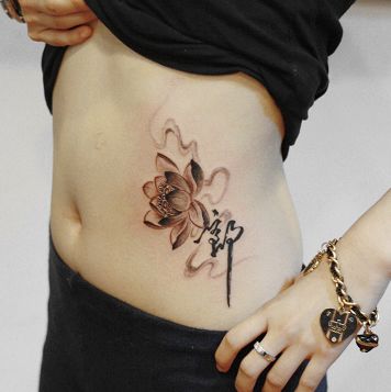 美女腹部精美的莲花汉字纹身图案