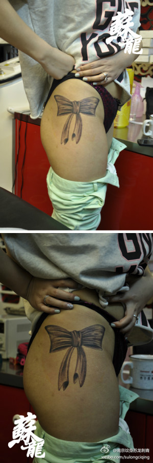 女人臀部唯美的黑灰蝴蝶结纹身图案