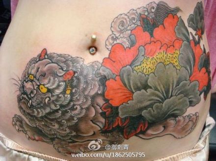 美女腹部经典很酷的唐狮子牡丹纹身图案
