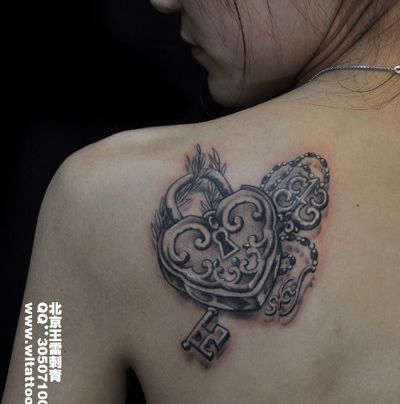 女孩子肩背精美的爱心锁钥匙纹身图案