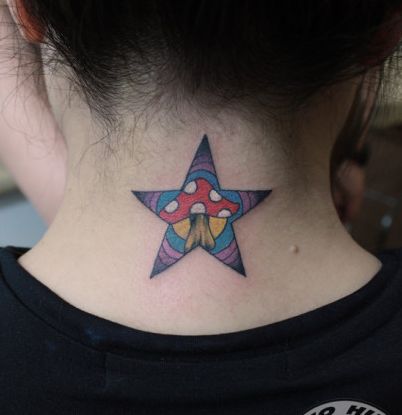 女生脖子处五角星蘑菇纹身图案