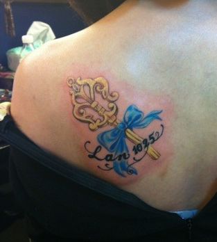 女生肩背精美的钥匙蝴蝶结纹身图案