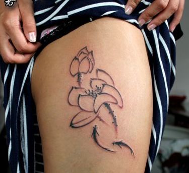 女孩子腿部水墨画风格莲花鲤鱼纹身图案