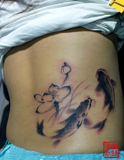 女孩子腰部水墨画鲤鱼莲花纹身图案