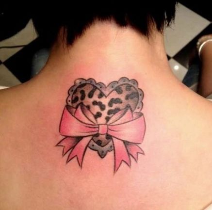女生背部蝴蝶结与豹纹爱心纹身图案
