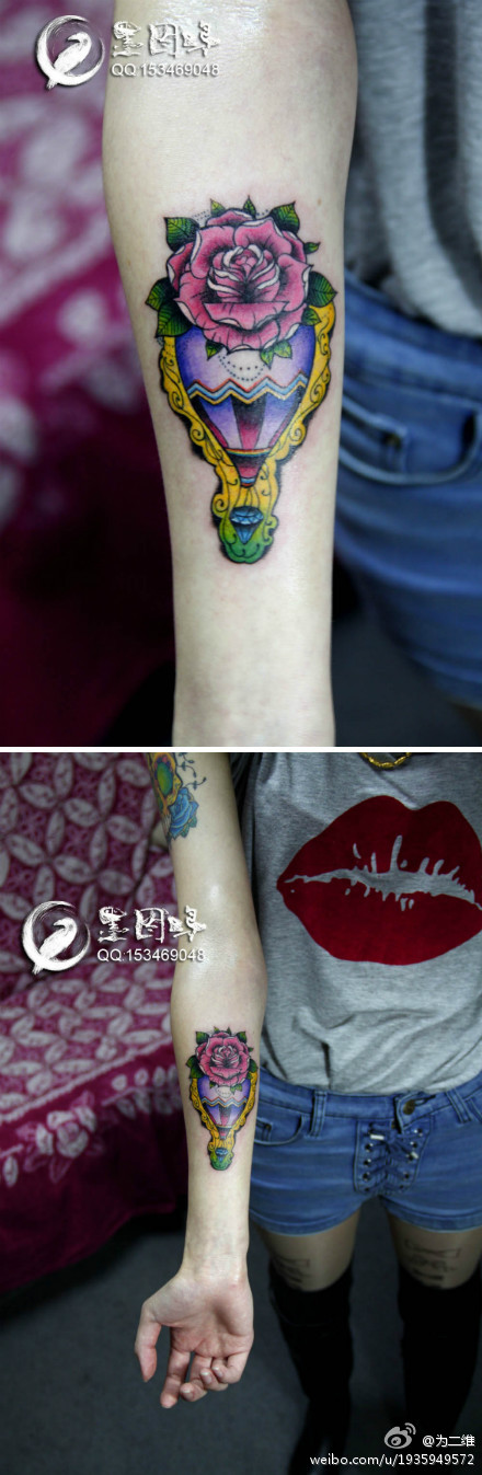 女生手臂漂亮的玫瑰花与热气球纹身图案