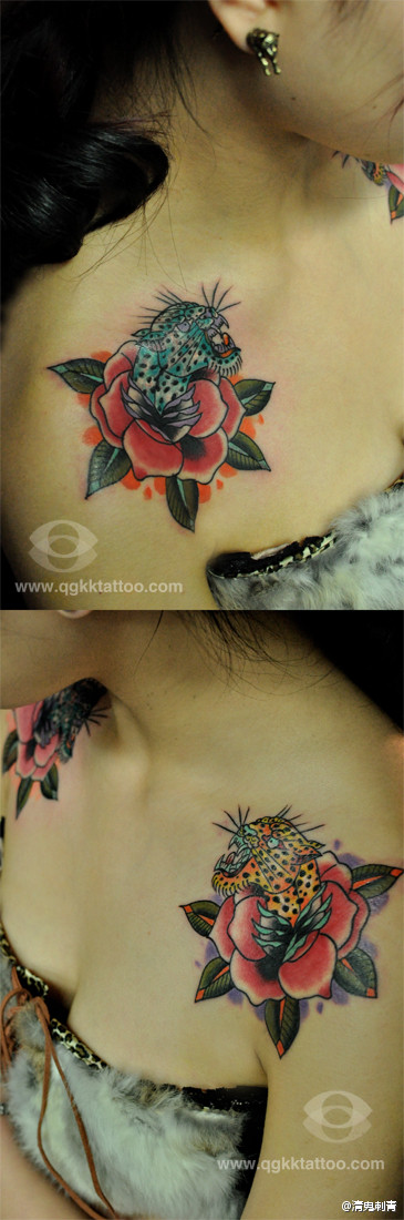 那肩膀处精美漂亮的玫瑰花豹子纹身图案