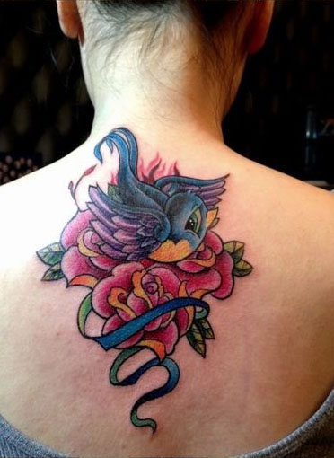 女生背部时尚漂亮的小燕子与玫瑰花纹身图案