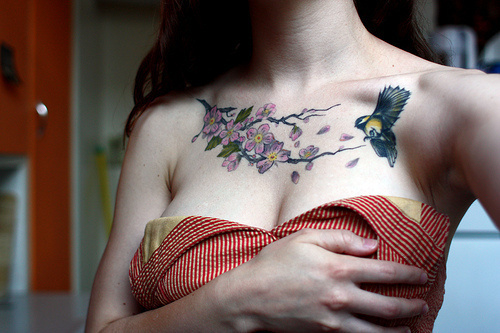女生胸部时尚流行的小鸟与花卉纹身图案