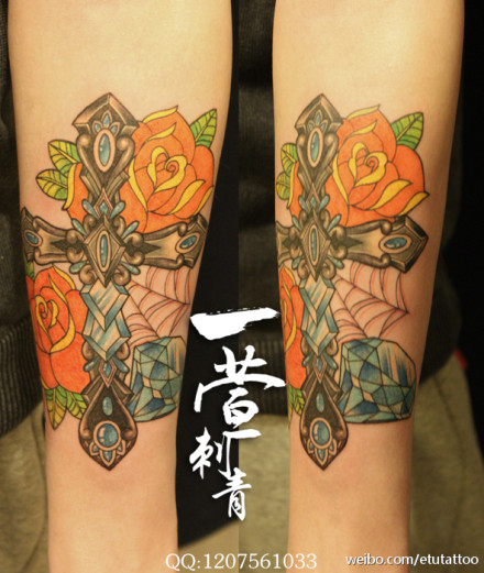 女生手臂时尚精美的十字架玫瑰花与钻石纹身图案