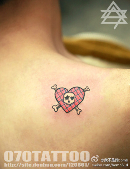 男生肩背可爱小巧的爱心骷髅纹身图案