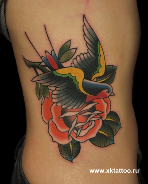 女生腰部唯美的小燕子与玫瑰花纹身图案