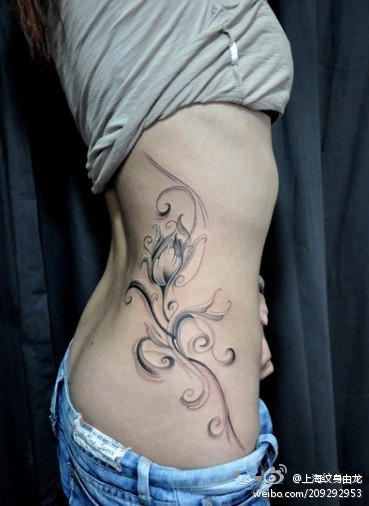 美女腰部唯美好看的莲花藤蔓纹身图案