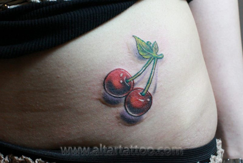 女生腰部时尚流行的小樱桃纹身图案