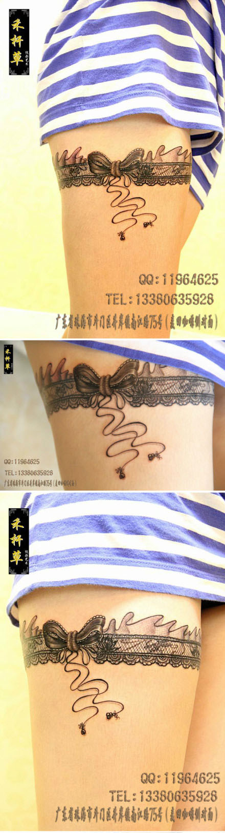 女生腿部性感时尚的蝴蝶结蕾丝纹身图案
