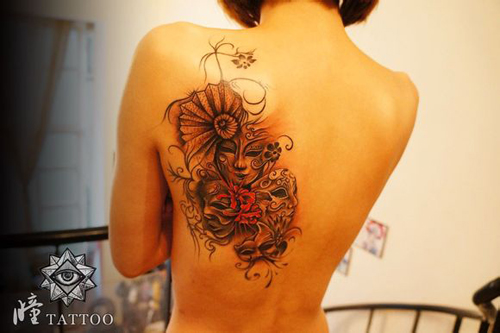 美女后背唯美漂亮的威尼斯面具纹身图案