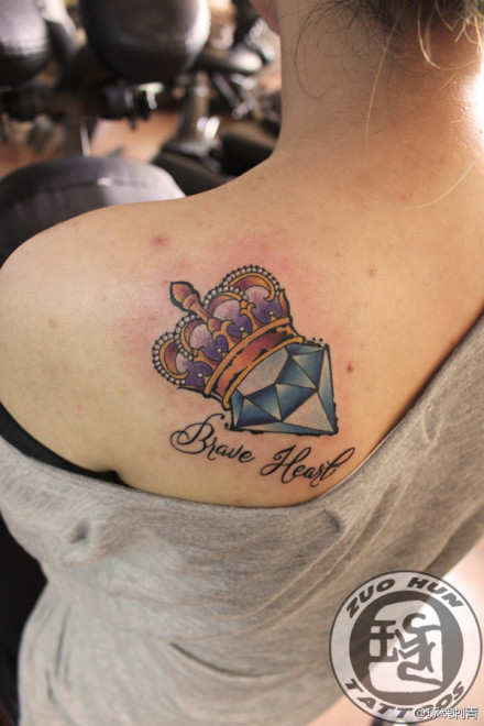 女生后背潮流精美的彩色皇冠钻石纹身图案