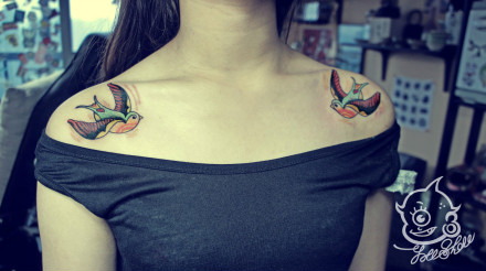 女生肩膀处潮流时尚的彩色小燕子纹身图案