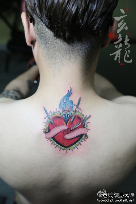 女生后背潮流时尚的彩色爱心纹身图案