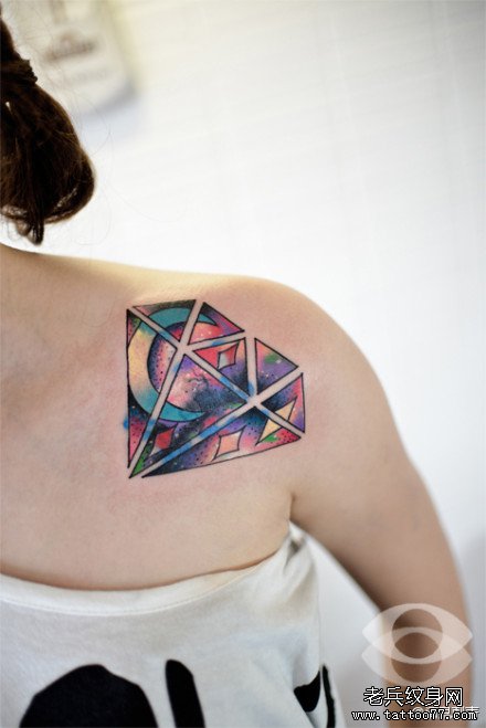 女生肩膀处潮流好看的彩色钻石纹身图案