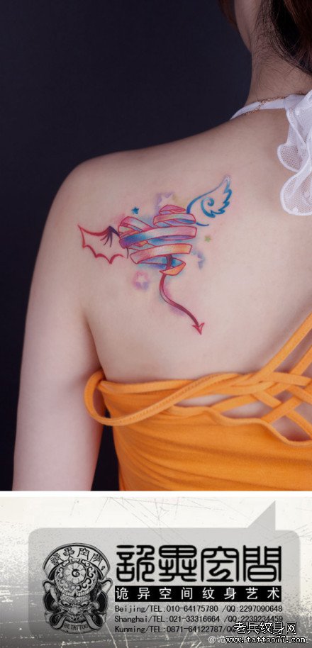 女生后肩背漂亮小巧的爱心翅膀纹身图案