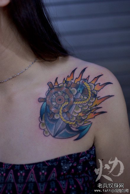 女生肩膀处时尚潮流的船锚船舵纹身图案