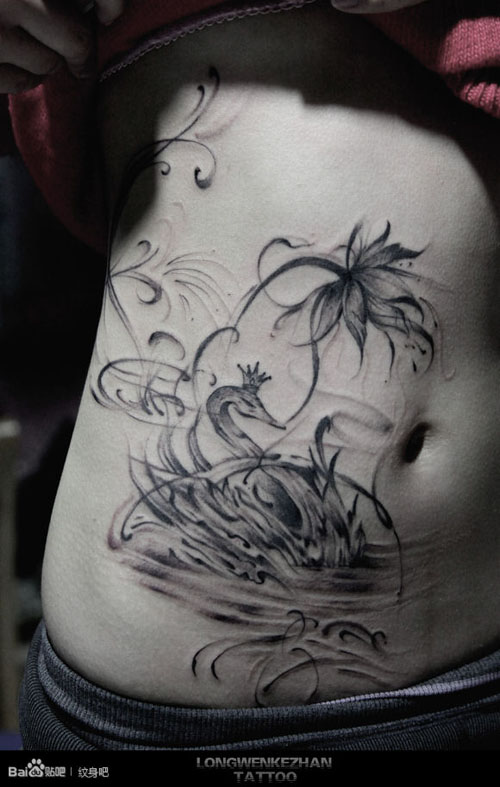 美女腹部唯美时尚的水墨天鹅纹身图案