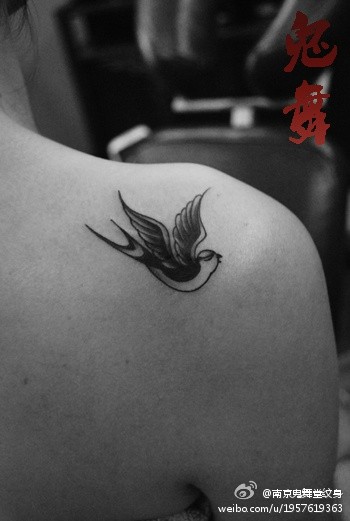女生肩膀处小巧时尚的黑灰燕子纹身图案