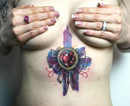 女生胸前时尚潮流的宝石蝴蝶结纹身图案