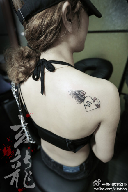 女生肩背小巧唯美的翅膀爱心纹身图案