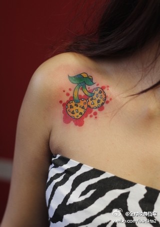 女生肩膀处潮流小巧的豹纹樱桃纹身图案