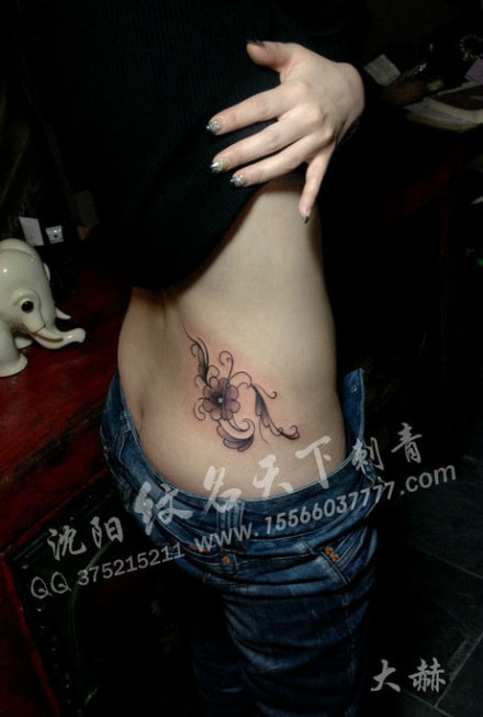女生腰部唯美潮流的黑灰四叶草纹身图案