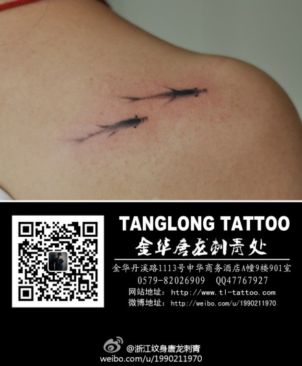 女生肩背水墨风格的写意小鲤鱼纹身图案