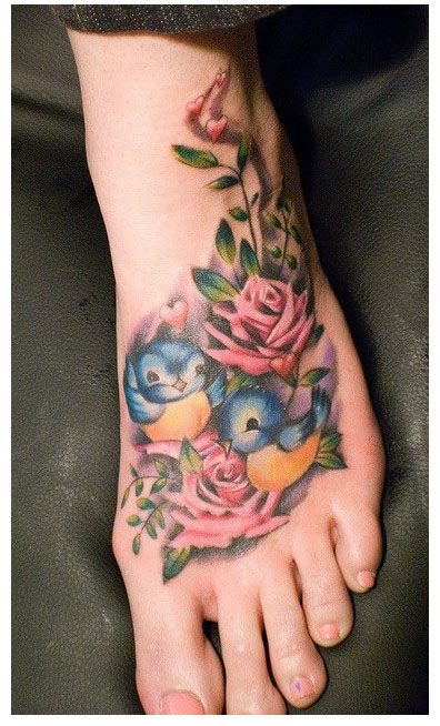 女生脚背可爱的小鸟与玫瑰花纹身图案