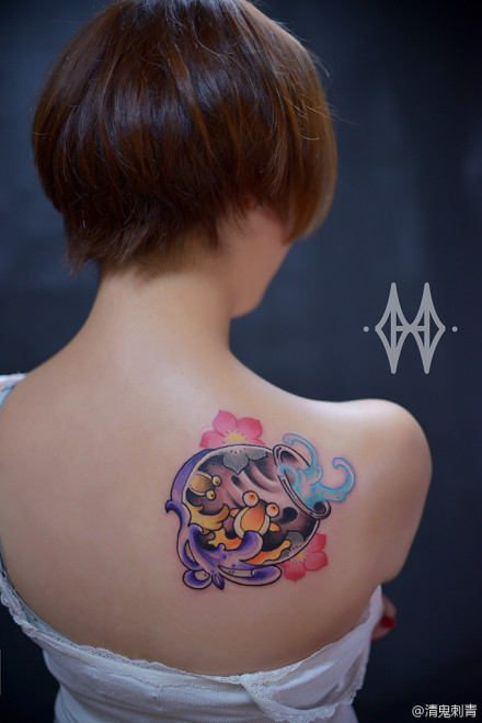 美女后背唯美的鱼缸与小金鱼纹身图案